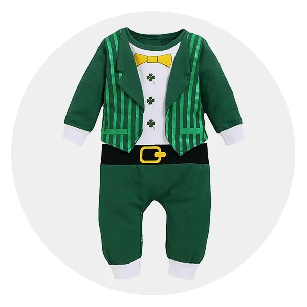 March 17 is fast approaching, which means it’s time to find baby’s St. Patrick’s Day outfit. Don’t worry, you’ve got the luck of the Irish on your side—and us, of course! Celebrate your little leprechaun’s first St. Paddy’s Day with a sham-rockin’ ensemble. Whether you’re searching for a dress adorned with traditional clovers, a cozy green pajama set or a punny St. Patrick’s Day T-shirt that’ll stir up some chuckles, we’ve got you covered. Here, you’ll find festive looks that meet the mark. Shopping for a tot instead? Don’t sweat it—we’ve found plenty of toddler St. Patrick’s Day outfits for girls and boys too, including adorable dresses, shirts and separates.