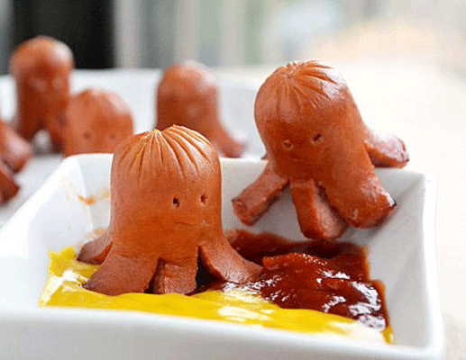How to make it: Prepare hot dogs as the package states. When they’re ready to eat, use a knife to cut them in half. Fray the edges by peeling back the skin on the hot dog (or use a knife to cut slices). Use a toothpick to make the eyes. Jazz it up with your favorite condiments. (For a slightly healthier spin, use organic, poultry hot dogs.)