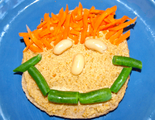 How to make it: Toast an English Muffin (or bagel or bread) and cut up some veggies or fruits, such as grapes, green beans, carrots, broccoli, beans, olives, strawberries and blueberries. After it’s toasted, put a little butter on top and use the fruits and veggies to make the face.
