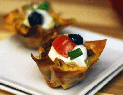 How to make it: Buy premade wonton wrappers in the frozen food section. Layer two together in a muffin pan and bake just until they’re cooked through. After you’ve cooked your taco meat according to the package directions, add a little in each cup and bake again, until warm. Add whatever taco toppings you like!