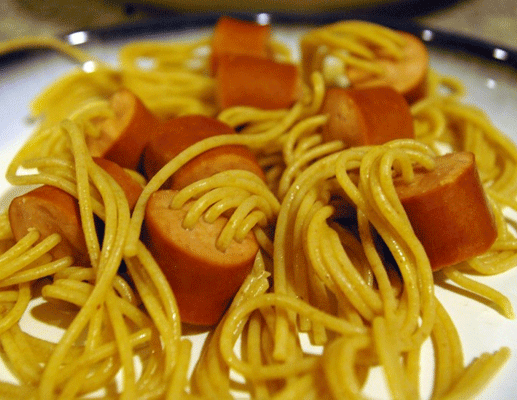 How to make it: Bring water to a boil. Before cooking the hot dog, cut it up into about 1 to 2-inch thick bite-size pieces. Poke uncooked spaghetti through each bite-size hot dog piece and then bring it to a boil on the stove. Voila!