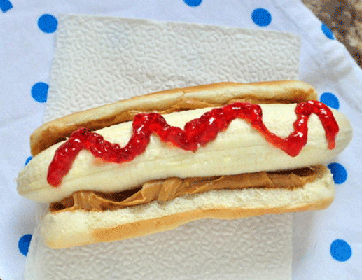 How to make it: Put some peanut butter on the inside of one half of a hot dog pun. Place a peeled banana inside and add a squirt of jelly on top to look like ketchup.