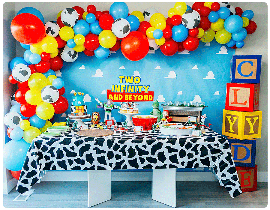 Toy Story is a classic that exemplifies the meaning of friendship—so it’s not surprising that it also makes for a popular 2-year-old birthday idea. For her son’s party, McKayla of Happily Ever Madsens decorated with a balloon arch featuring red, blue, yellow and cow-print, as well as a themed wall banner and big block letters to spell out her son’s name. She even decorated her front porch with cardboard boxes for “Clyde’s toys” and character balloons.