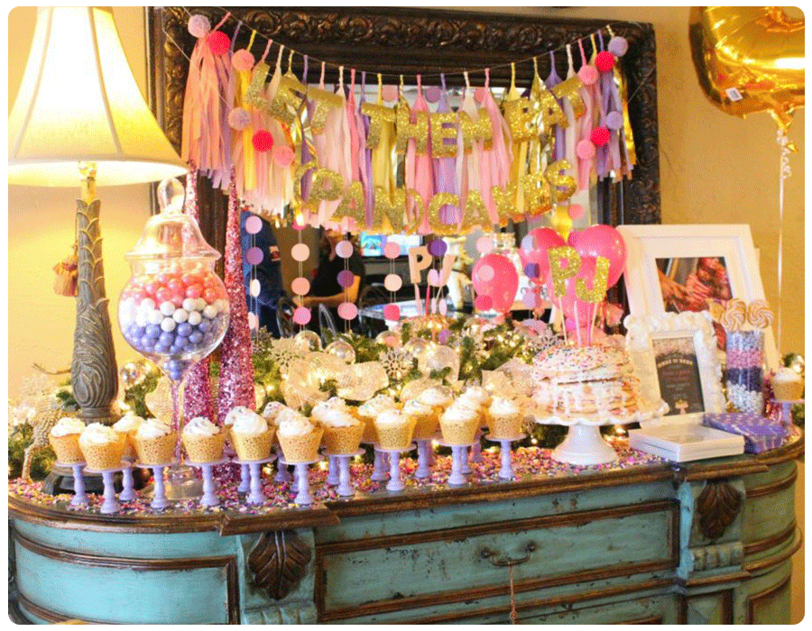 If you’re looking for a sweet and simple second birthday theme, look no further than this one from Amber of The Massey Spot. For the party, she stuck with a purple, pink and gold color palette, and asked guests to come dressed in their favorite pajamas and slippers. Decorations included pink and purple streamers, a gold “let them eat pancakes” banner and pink balloons.