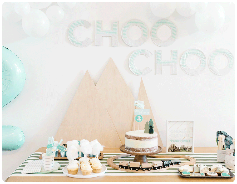 If your little one loves all things trains, consider this classic birthday theme. For her son’s 2nd birthday party, Merissa of Emelbe Design combined a mountain and train theme. For decorations, she used a wooden mountain sign, a blue “2” balloon, white balloons tied together to look like clouds and a “choo choo” wall sign she made using striped paper plates. She also set up a wooden train set around the birthday cake, which was topped with wooden green trees and a “choo choo” topper. Leaning into the mountain theme, she ordered cupcakes with cotton candy “clouds” on top and custom cookies.