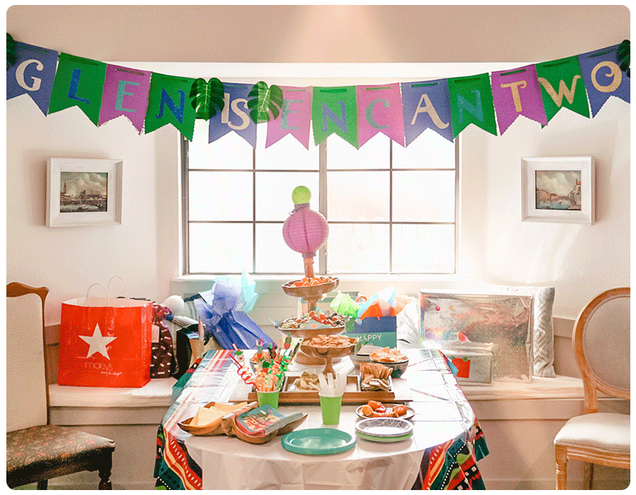 We’re still seeing lots of 2-year-old birthday themes for boys and girls inspired by the smash hit Encanto. For her son’s second birthday party, Morgan of Morgan Ma Belle, DIYed most of her decorations. These included a banner, made of green, blue and purple construction paper, spelling out “Glen is Encantwo,” a cactus balloon plant and balloon arch and a print of Antonio’s magic door.