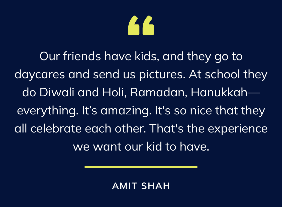 AS: Our friends have kids, and they go to daycares and send us pictures. At school they do Diwali and Holi, Ramadan, Hanukkah—everything. It’s amazing. It’s so nice that they all celebrate each other. That’s the experience we want our kid to have.