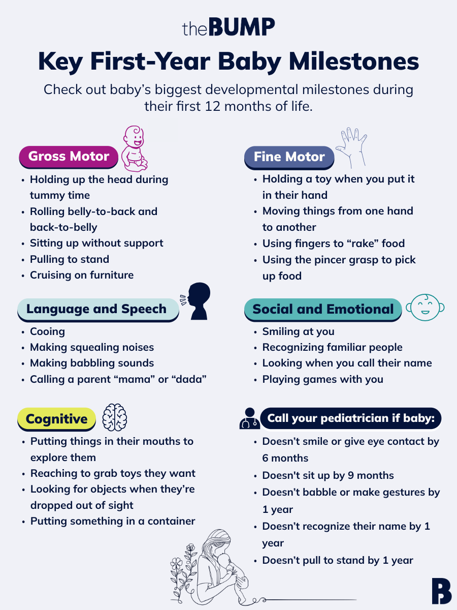 Baby milestones are skills babies exhibit that show they’re growing and developing as expected. They include gross and fine motor skills, language development, social and emotional learning, cognitive achievements and more. Your pediatrician will track infant milestones at baby’s well-check visits by doing a physical exam and interacting with baby to see how they move, play and make sounds. If baby hasn’t reached certain milestones by the expected age, your doctor may suggest screenings to check for developmental delays. They may also recommend early intervention, which can include physical, occupational and speech therapy. “Our firstborn had a speech delay—he was born with hearing loss—and early intervention was fabulous,” says The Bump community member EricandKaren. “Best thing that could’ve happened to us! He decided to start talking one day and hasn’t ever stopped.”