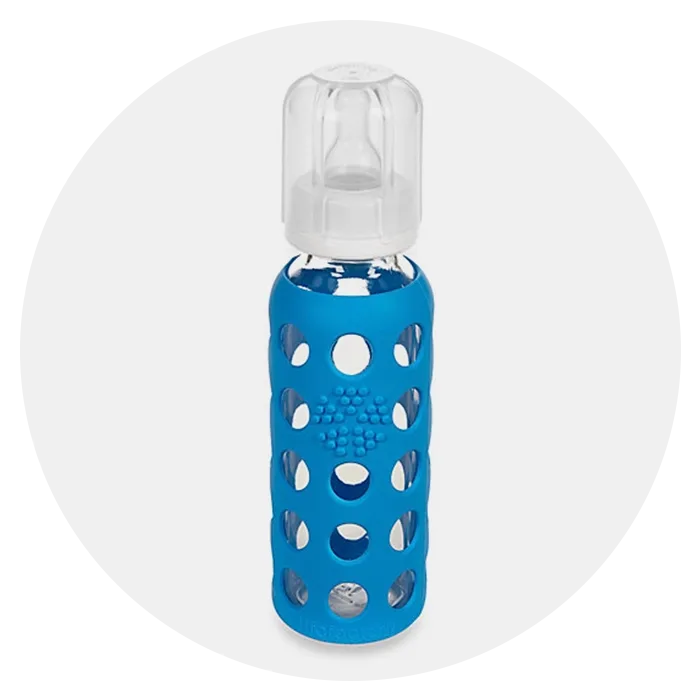 Colorful silicone sleeves protect this glass bottle from breaking—and lend it a super-mod look. All components, including nipples, stoppers and even the silicone sleeve, are free of BPA and phthalates, so no worries if baby chews on them.