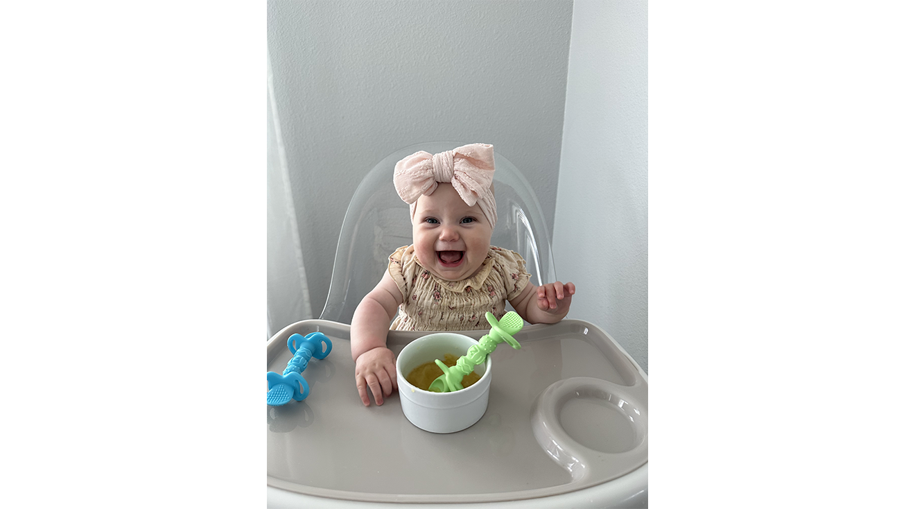 Janice also notes that the shallow shape made it “easy to get the food off the spoon and into her mouth.” She appreciated the built-in choke guard and soft, BPA-free silicone which gave her added peace of mind as her new self-feeder chewed and practiced with the spoon.