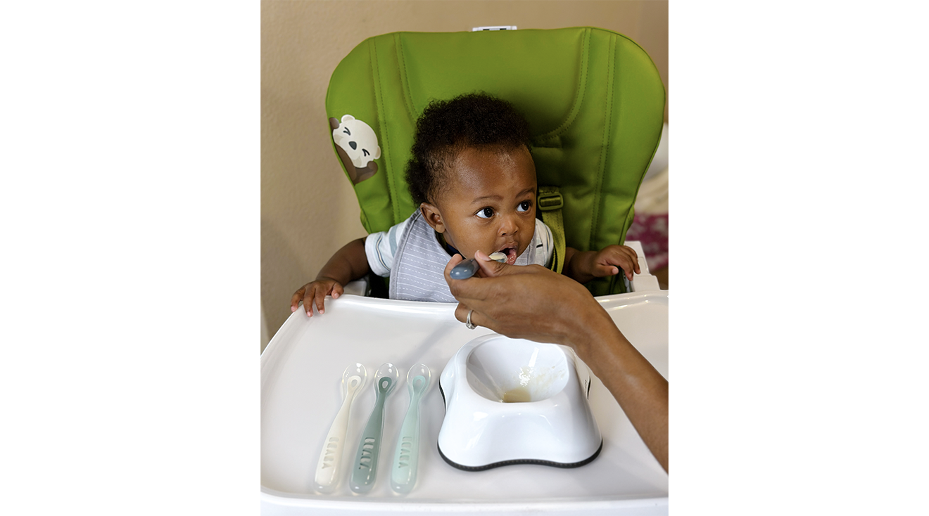 “If you think about what you eat as an adult, you likely eat food that is purée (yogurt, soup) and solids (fruit, vegetables, meats, breads),” says Callahan. “It’s important for babies to learn to eat all textures of foods, and to practice using utensils from the start.” Even if baby is confidently picking up finger foods, early exposure to utensils helps them build self-feeding skills.