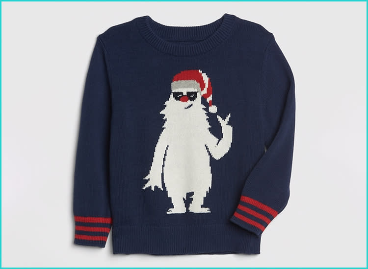 Dinosaurs are cool. Dinosaurs in Santa hats are even cooler. But the coolest thing about this toddler Christmas sweater is that your opinionated kid will be amped to wear it. The “ugly” design is actually quite dapper!