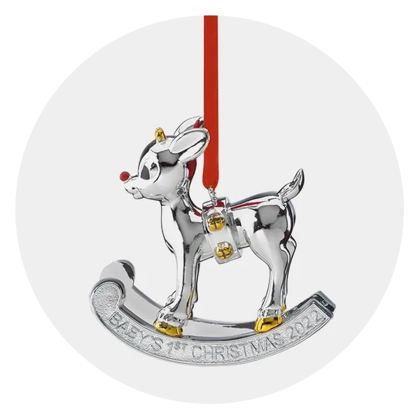 What could be more classic than a Rudolph ornament to commemorate baby's first holiday season? Accented with gold horns and hoofs and wearing a red scarf to match his nose, this adorable reindeer will look sweet on your tree for years to come.