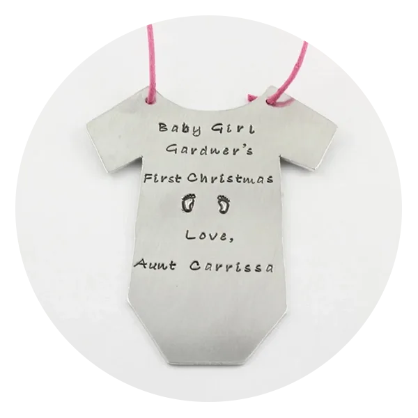 If you’re going with a silver color scheme for your tree, this metal option will fit right in. Add the date and a personalized note for a super-cute first Christmas ornament.