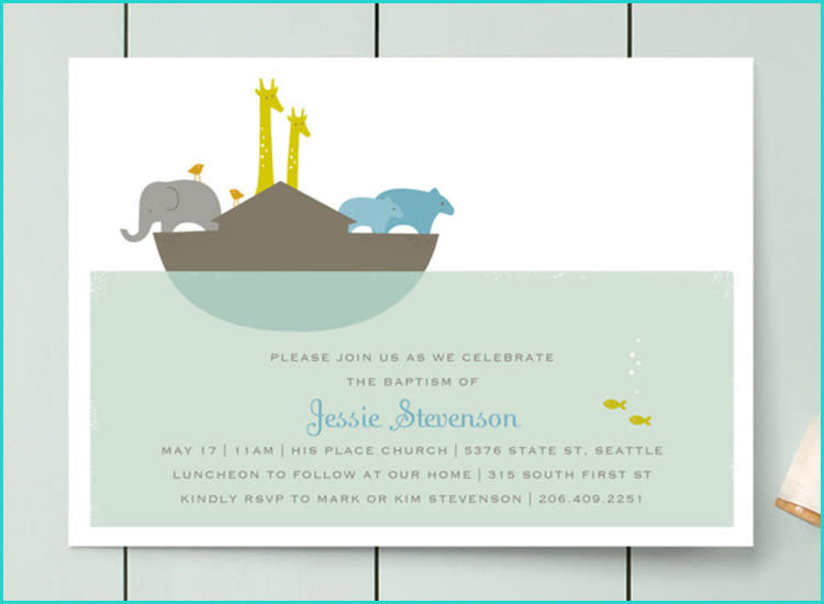 Cartoon critters, based off the story of Noah’s Ark, give these baptism invitations a playful touch.