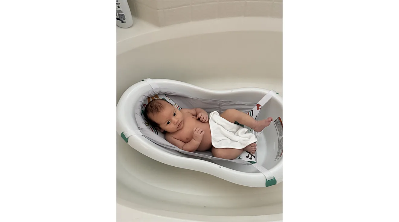 “The sling helps your baby feel very comfy and minimizes slipping. The pillow helped me be able to position him against the back of the tub and he loved being able to wiggle and play while I washed him.”