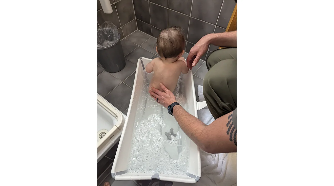 This is such a special design that we decided to really put it through its paces and sent it on a trip to Europe with our product tester Janelle, who was on vacation with her 8-month-old daughter. She reports that it was “really easy to set up! I just popped it open and filled it using the flexible arm of the shower.” The fold is simple, done in one quick motion and doesn’t come at the cost of the tub’s integrity—Janelle says there were no leaks while she used it.