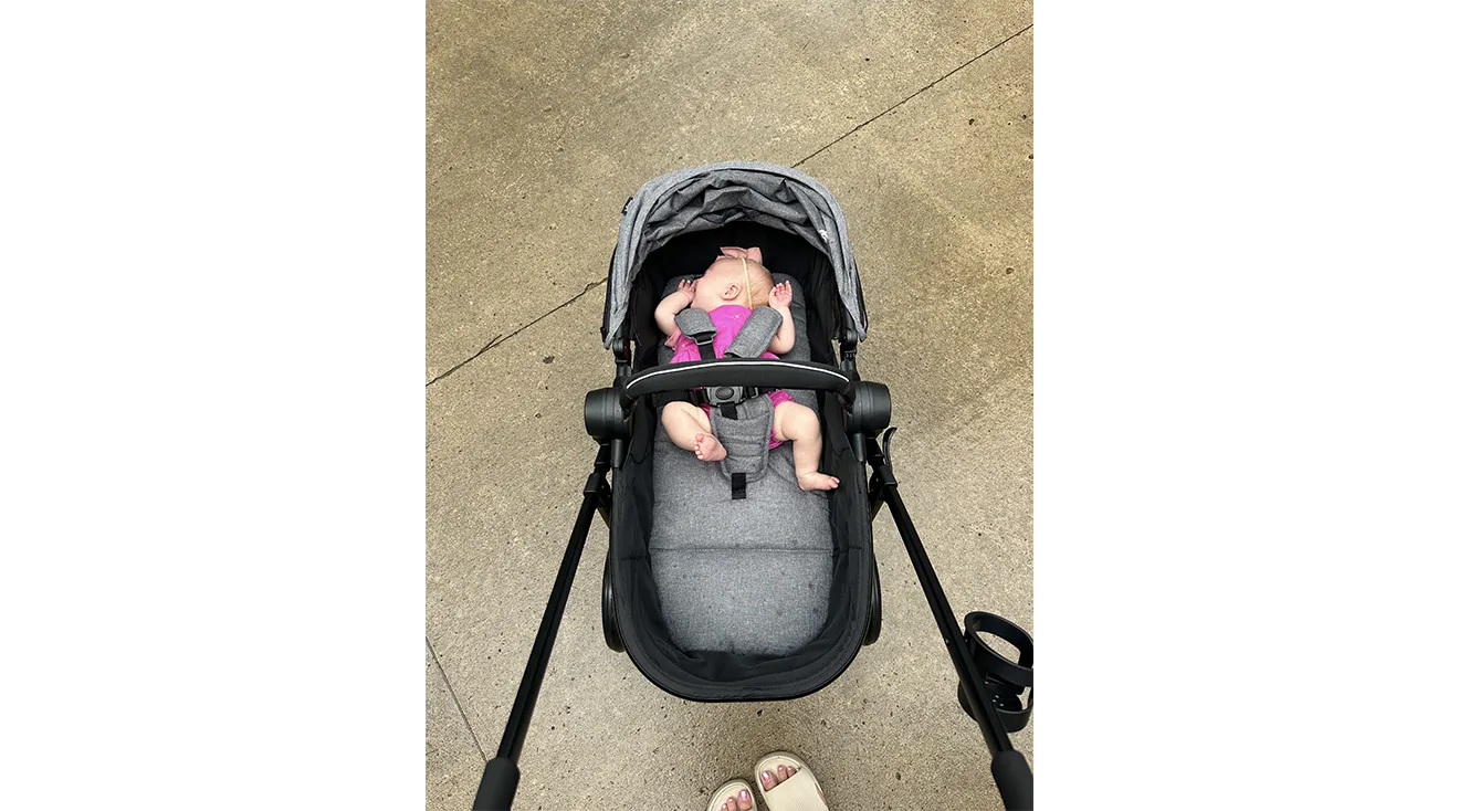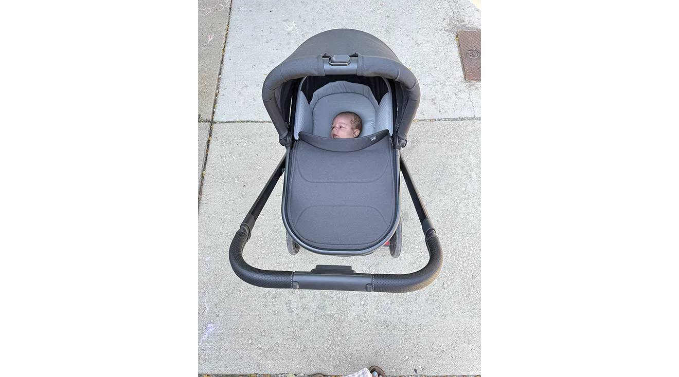 Our tester, Laurie D., a mom of a 2-month-old and a one-year-old, agreed, telling us that “it was easy to maneuver with just one hand.” She pushed the stroller on flat terrain, sidewalks, bumpy pavers and grass, and never had any issues with pushing, whether folded into the seat position for her toddler or extended into the bassinet for her baby. This smooth ride translates to better naps. “Steering and maneuvering on bumpy pavers wasn’t as rough as with other strollers I’ve tried, and it actually helped my baby fall asleep much more easily while in the bassinet,” says Laurie.