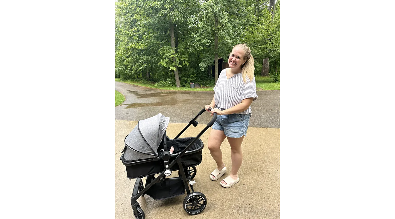The stroller also earned high marks for maneuverability. “It feels light, turns well and handles curbs with minimal effort,” Katelyn explains, noting the turn radius made it easy to navigate busy spaces. However, she did feel bumps on loose gravel and lost the smooth control she enjoyed on pavement. This is because the Mompush Ultimate 2 uses lightweight, affordable ethylene-vinyl acetate (EVA) foam wheels. While they give you excellent turn-on-a-dime maneuverability on smooth surfaces, they don't handle loose, uneven terrain like gravel as well as higher-end polyurethane (PU) foam wheels, like those found on the UPPAbaby Cruz V3. So while it may not be the best fit for country living, it’s still a great choice for urban environments. “I feel like the stroller is a great fit for city or town life,” confirms Katelyn. “It handles sidewalks, curbs and store aisles really well,” she adds.