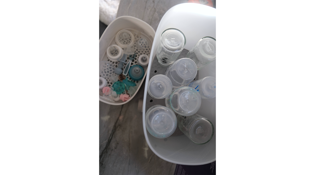 Despite its smaller footprint, this bottle sterilizer has a decent capacity. One groggy morning, I fit five narrow-mouth bottles—including a tall 8-ounce one—in the bottle compartment, along with a handful of nipples and rings in the accessory basket. On another day, I sterilized two breast shields, two pacifiers, two nipples with their rings and a teether toy. If you’re using wide-mouth bottles, the compartment fits four. And, on a separate occasion, I was also able to fit two silicone feeding plates. I like the height of the unit because you can fit tall bottles without needing to adjust the accessory rack, and it’s still small enough to fit underneath a cabinet or be put away for storage.