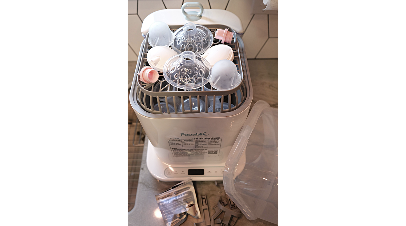The bottle washer and sterilizer has a large capacity, meaning I only needed to run the machine once a day for my family. It holds eight bottles and its parts or a full breast pump (both sides), its parts, one milk collector, and three bottles. Compared to other bottle washers I tested, this Papablic pick has a smaller footprint, but it still takes up a substantial amount of counter space.