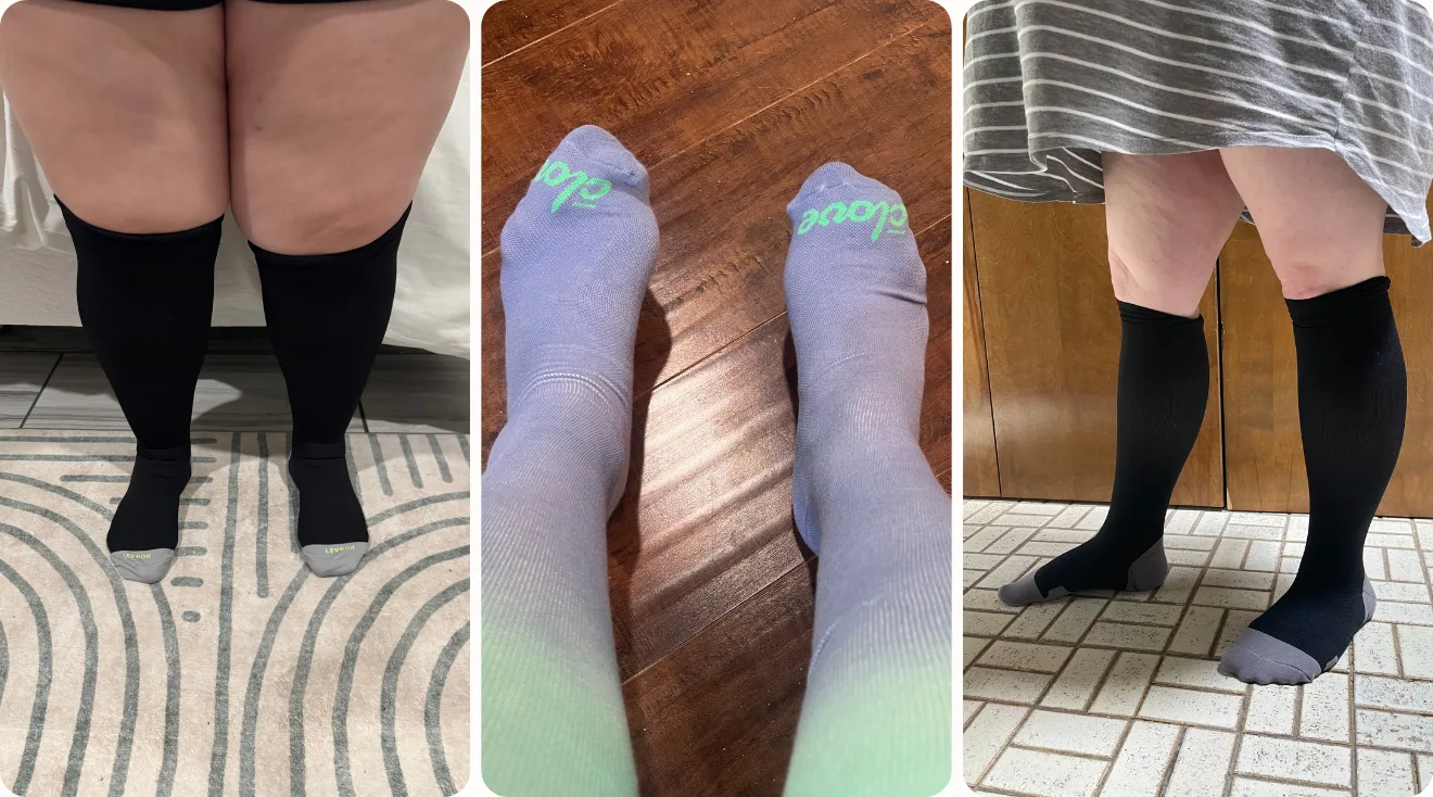 The fit is snug but not restrictive, with enough stretch to accommodate curves and swelling throughout the day. Lauren noticed less swelling in both her feet and calves, with foot relief happening quickly and calf support building the longer she wore them. “The more I was on my feet, the better my calves felt,” she shares.