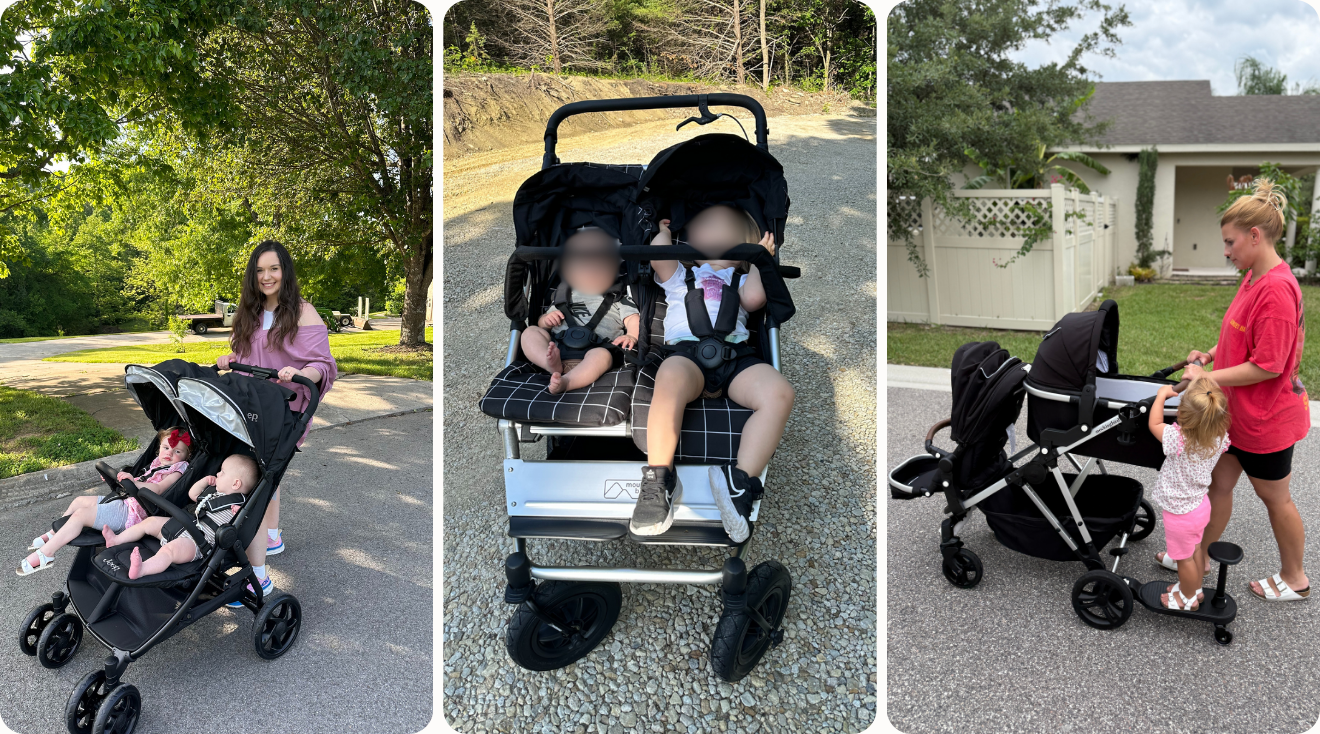 - We enlisted the help of 16 independent product testers—all parents of twins or stroller-age siblings ranging from 6 weeks to 4 years old—to use these strollers in a variety of real-world conditions, from rough terrain to smooth sidewalks and crowded stores. These parents also evaluated each stroller’s performance in single, double and even triple mode (using accessories such as stroller boards).