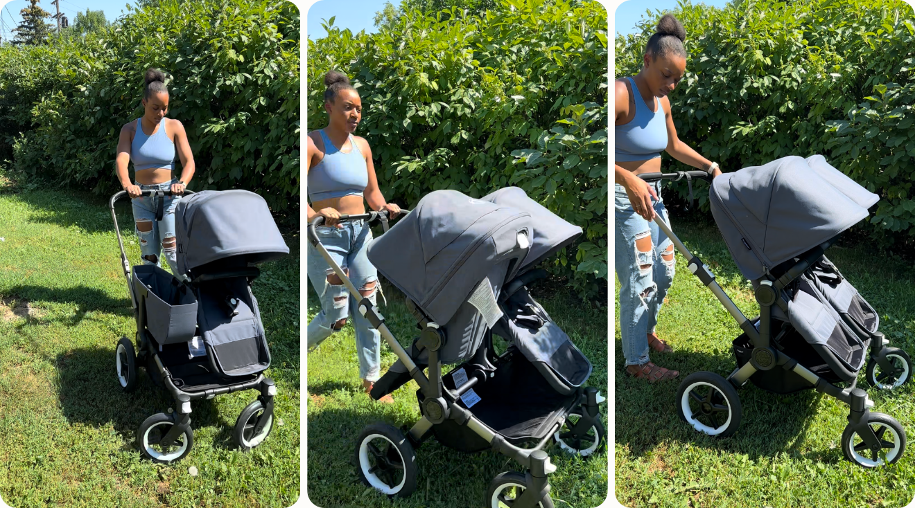 One of the key features of the Bugaboo Kangaroo is that you can place the infant bassinet facing you in the top position in double mode. Some single-to-double strollers we tested, including the UPPAbaby Vista V3, only allow you to have the bassinet placed on the bottom when in double mode, putting your infant close to the ground and far out of sight. But the Kangaroo keeps newborns where parents can see them. That said, you do need to purchase an additional adaptor to put the bassinet on top. The toddler seat can also face outwards when the bassinet is in use on the Kangaroo, which is another configuration that’s surprisingly uncommon in single-to-double strollers. “There are many different modes for this stroller and I liked all of them that we tried,” Shawna gushes. “It’s cool to switch up the different seating arrangements for the kids and they liked it too!”