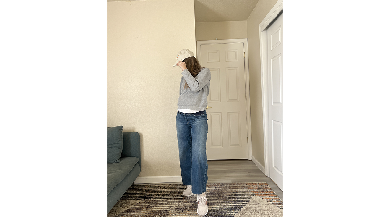 I’m still new to wide-leg jeans, but man did these make me feel cool! They were undeniably stylish and a great non-traditional option for maternity jeans. I think expectant moms (especially younger ones) would appreciate this style and the freedom it gives to create outfits that are “in” right now. The medium blue wash denim had a worn-in, faded look to it and distressed details and raw hems added to the cool, vintage vibe. I did have to take a peek at Pinterest for inspiration, but styling these jeans with items from my closet was actually pretty easy and fun. I liked to pair them with a casual tee, sweater, chunky sneakers and a baseball cap for an off-duty mom look. Although I found this style flattering, it might not be a good choice for more petite body types as the wide leg style could feel overwhelming on a smaller frame.