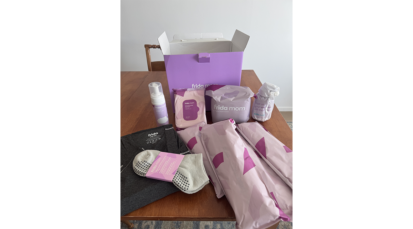 The Frida Mom Labor and Delivery + Postpartum Recovery kit includes a delivery and nursing gown, a peri bottle, four pairs of disposable underwear, grippy socks, four instant ice maxi pads, 24 perineal cooling pad liners, perineal healing foam and a travel bag.