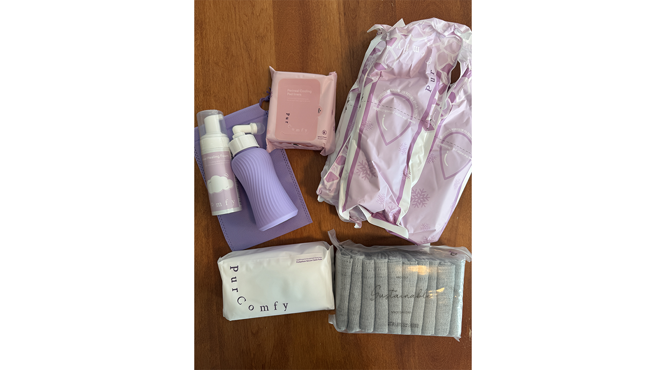 The Purcomfy Postpartum Essentials Recovery Kit includes a peri bottle, five pairs of disposable underwear, five disposable pads, five instant ice pads, 24 witch hazel perineal liners and perineal soothing foam.