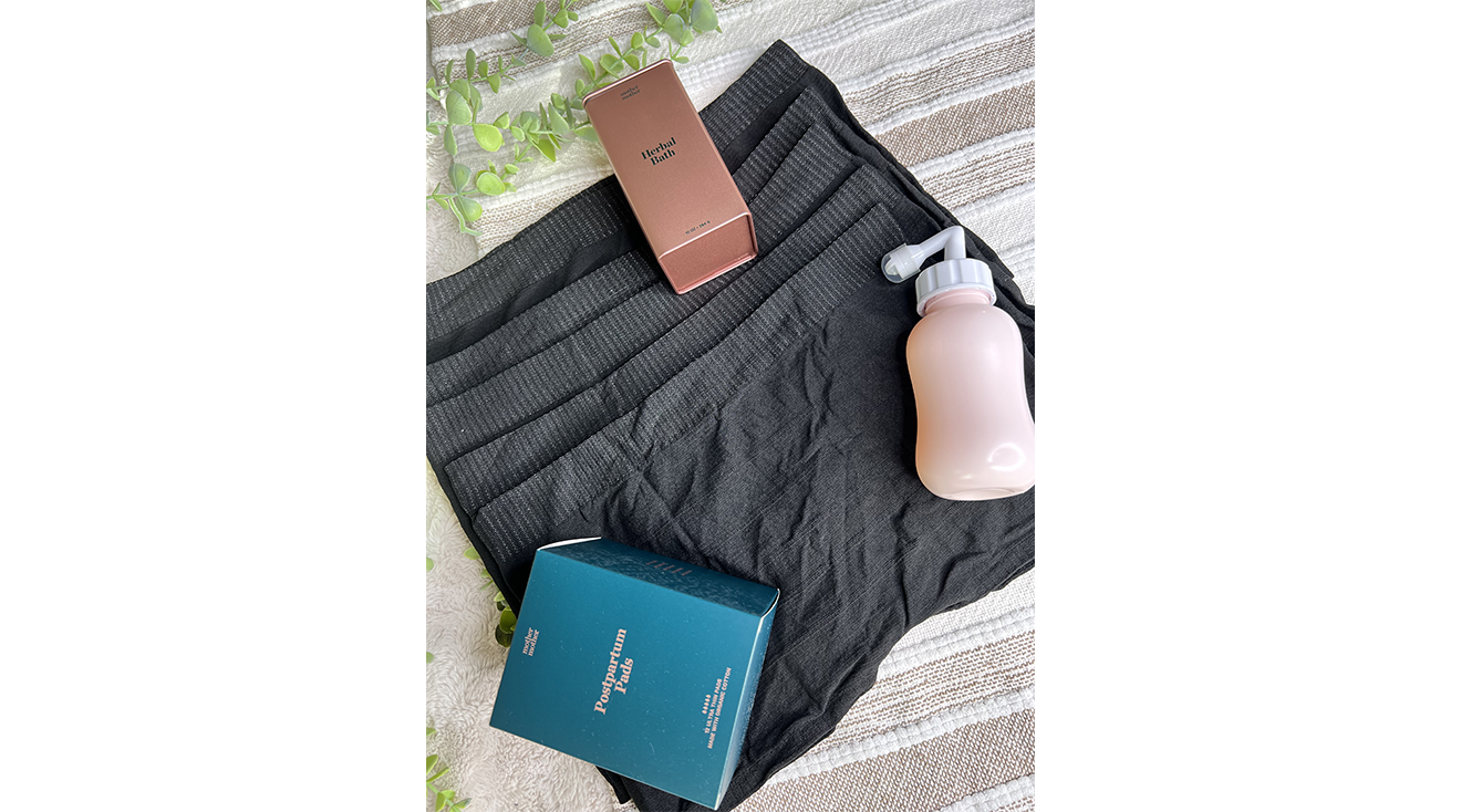 The Mother Mother Postpartum Recovery Bundle includes five pairs of disposable mesh underwear, a peri bottle, 12 overnight pads and an organic herbal sitz bath.
