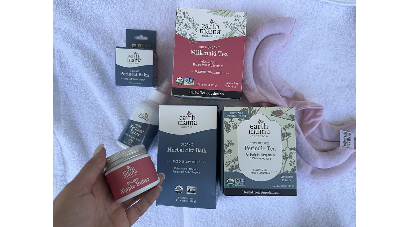 The Earth Mama Organics Postpartum Recovery Collection includes herbal perineal spray, herbal sitz bath, organic perineal balm, organic periodic tea, organic nipple butter, organic milkmaid tea and a pair of booby tubes, which can be warmed to stimulate milk supply
