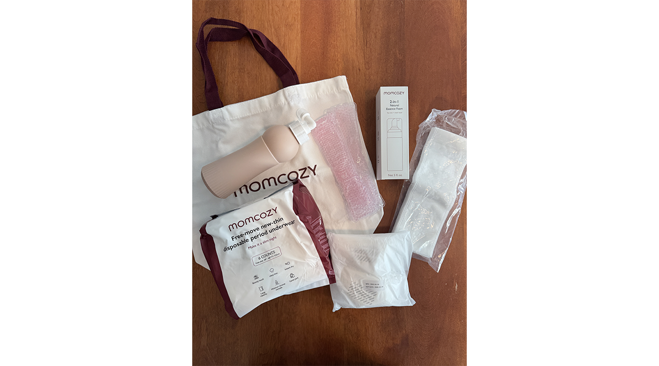 The Momcozy Postpartum Recovery Essentials Kit includes six pairs of disposable underwear, a peri bottle, witch hazel cooling foam, 20 disposable nursing pads, two reusable cold pads with disposable covers and a canvas tote.