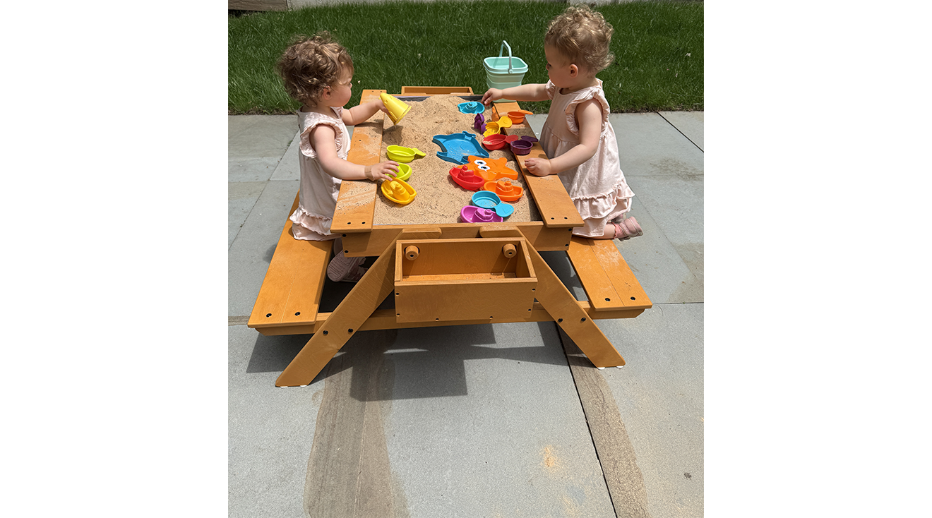 Mackenzie’s twin girls loved playing with this table in sand and picnic mode, earning it a 10 out of 10 score for play and entertainment value. “[It] allowed my children to interact with each other very easily and cooperatively because there was so much room,” says Mackenzie. “My twin toddlers loved to sit on the picnic table benches to eat snacks, do crafts and pretend play with their dolls,” shares Mackenzie. She went on to tell us that her kids played with the sand table for up to 15 minutes at a time, which is great for a 2-year-old’s attention span. Speaking about her eldest twin’s reaction, Mackenzie told us: “When it was filled with sand, she grabbed a bucket and said ‘I am so excited.’” Overall, Mackenzie loved this picnic and sand table as it kept her kids occupied and playing collaboratively for long periods of time—a mom win right there!”