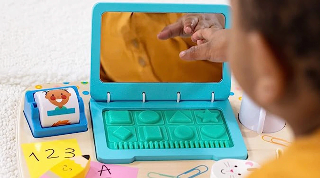 Looking for a computer toy that’s a bit more analog? Check out this colorful wooden activity board from Melissa & Doug. Your little one will love discovering the textures, sounds and other sensory delights this play set has to offer. When opening the toy laptop, they’ll find a mirror to nurture their budding social development, and buttons in various shapes to enhance their fine motor skills. Other details your child will love include the rolling contact list, the spinning pencil and the sliding wooden mouse.