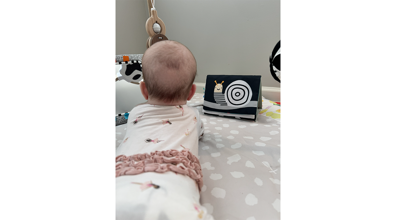 For the point in visual development that Carrie's daughter had reached during testing, the black and white pages were a particularly good fit. "She especially loved the black and white contrast pages and I found that she reached for the toy often," Carrie says. Standing the book up during tummy time gives baby a clear point to focus on, which Carrie appreciated—she says, “The way that the toy stands on its own really helped my baby.” What's more, the toy engages senses beyond the eyes, with crinkle pages and an attached teether.