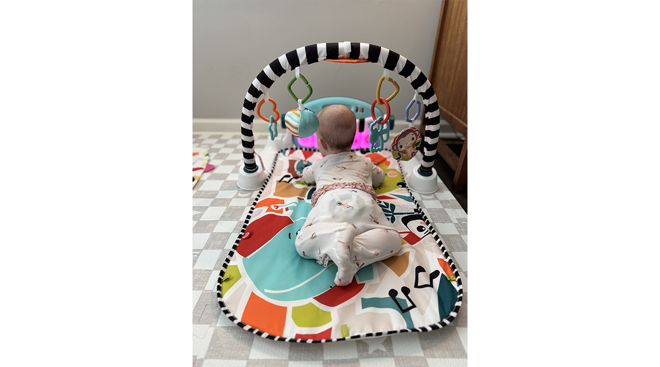 Holding baby's attention like this paid off—during testing she got a workout, using the toy in multiple positions including her tummy, back and side. Carrie says, "She thoroughly enjoys swinging her arms to hit the detachable toys along the arch as well as kicking her feet to make sounds with the keyboard." The motivating music also kept her engaged for meaningful stretches. The mat is on the narrow side—Carrie warns that "The only downside is there is not much room for babies to roll over if they want to go from tummy to back or vice versa," adding that this sometimes frustrated her child—and padding is minimal, but the overall play experience was a daily win for this household.