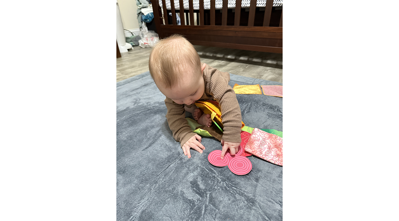 “We have played with this toy in multiple positions, including laying on his back, laying on his belly, sitting, and supported sitting. He was able to pull out a piece and bring it to his mouth or bring it to his other hand at his midline. The varied textures kept him interested and exploring.”