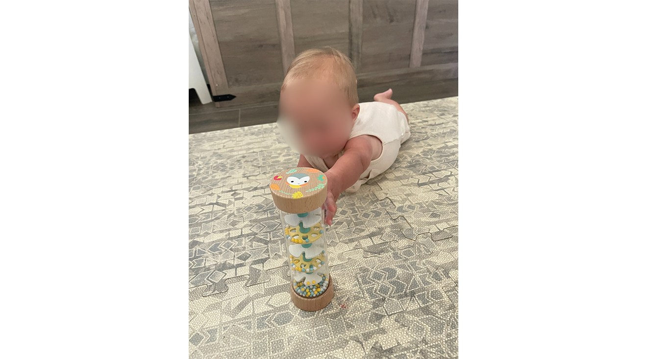 More importantly, the toy kept her baby engaged during tummy time and while sitting up, without causing frustration. “He was very perplexed and intrigued when he first saw the toy,” Caitlyn shared. But “once he started rolling it and saw the movement and heard the noise, he became visually excited.” Shaking, rolling or simply watching the beads fall all provided different ways to play, making the Janod Pure Rainstick surprisingly versatile. And while her 6-month-old struggled to grab the toy with one hand, its lightweight design made it easy for him to grasp it and lift it with both hands.