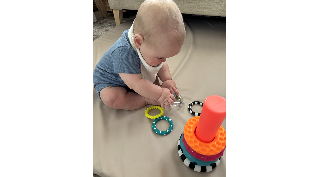 “It’s also helpful for practicing depth perception as I scatter the rings slightly out of reach—he tries to scoot or lean forward to grab them, and he’s often successful.” While he isn’t stacking yet, the design makes that the next natural step. She added that the toy is “simple, but it invites open-ended play that works at different developmental levels,” keeping it useful beyond the first year.