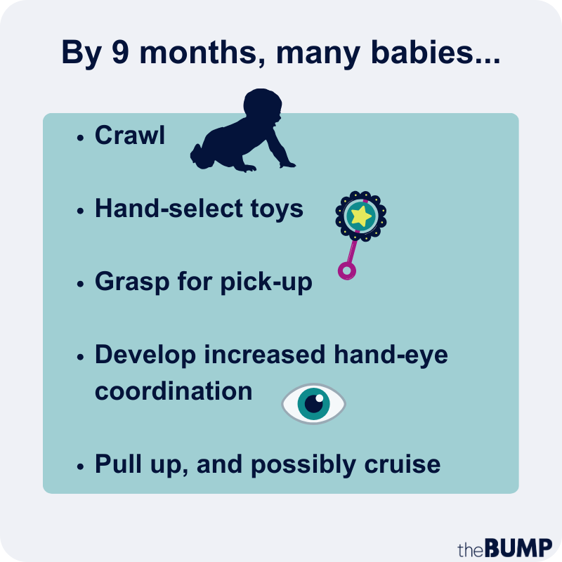 While Monness identifies that crawling and movement are happening around this time, she specifies, “I don’t like to say exactly when for milestones because there’s such a range.” Keeping that in mind, here’s what you can typically expect from your little one at this age: