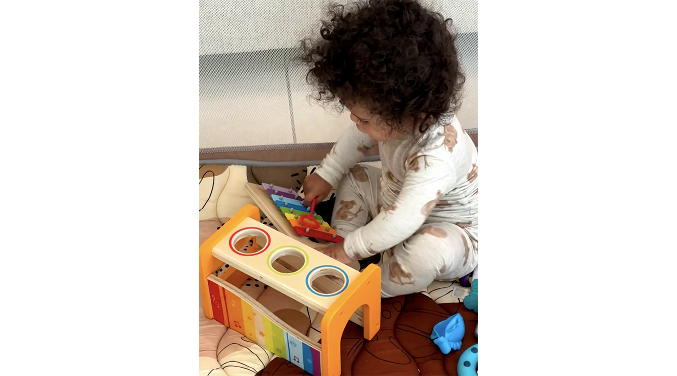 The Pound & Tap Bench comes with a booklet on how to play different nursery rhymes on the xylophone, which Larissa found "so cute." Her son was first drawn to the balls, but once she showed him the xylophone and how to use it, "he started to play around with it more and more day by day. I think he would have figured it out on his own so I would say it is a very intuitive toy." He even wants to bring it in the car with him—and thankfully it's small and lightweight enough that it travels well!