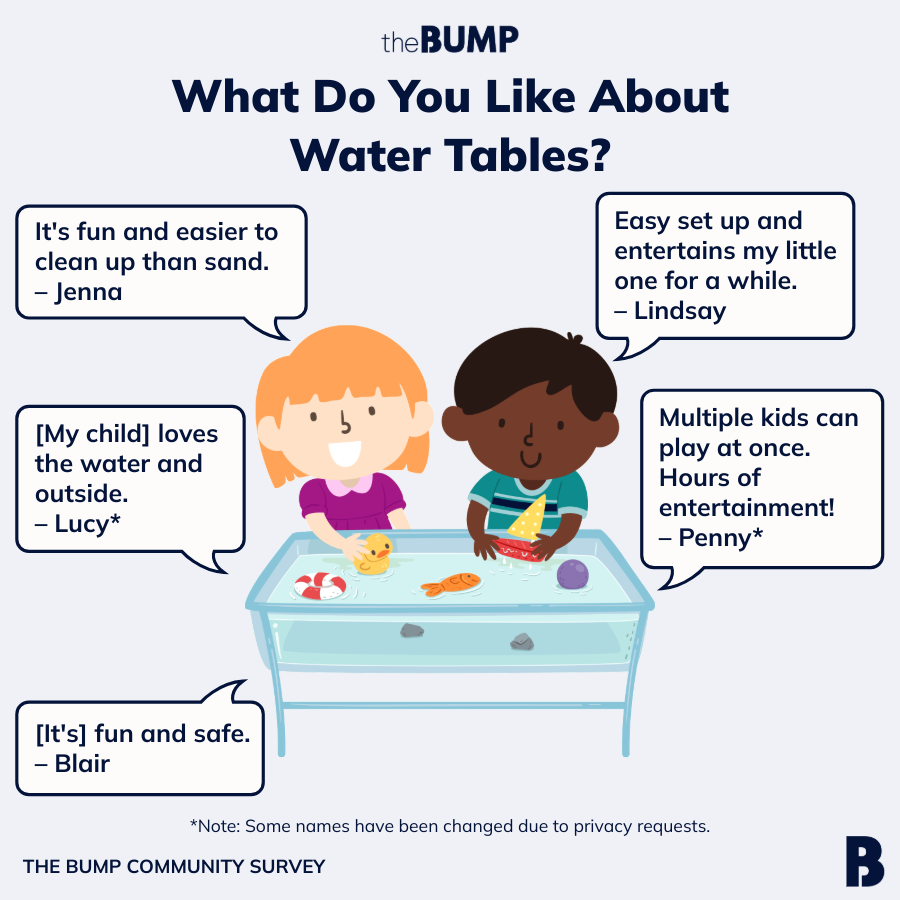 - We reached out to parents who own a water table in order to learn from their first-hand experiences, and researched what was being said about toddler water tables in The Bump forums to discover what parents liked and disliked about certain brands and products.