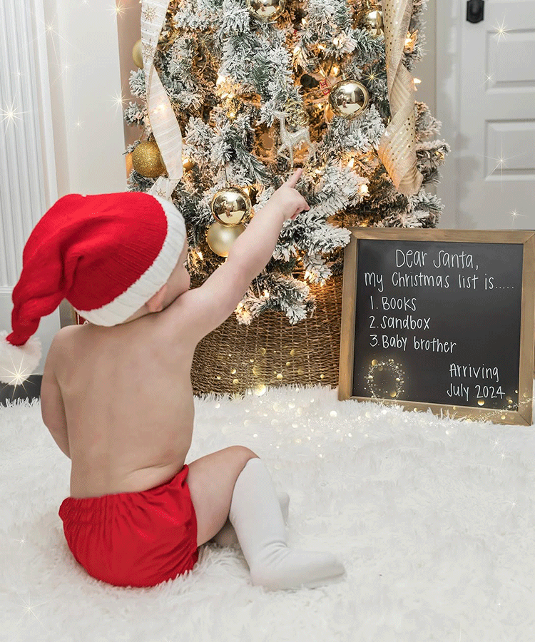 Has your child been whispering sibling wishes to Santa all year? Announce the arrival of their built-in best friend with a charming letter board, capturing their excitement and commemorating their anticipation.