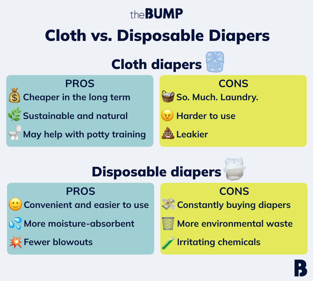 - Disposable diapers are more convenient and have better moisture-absorbing properties. But they can get expensive, and some parents have concerns about chemical ingredients.