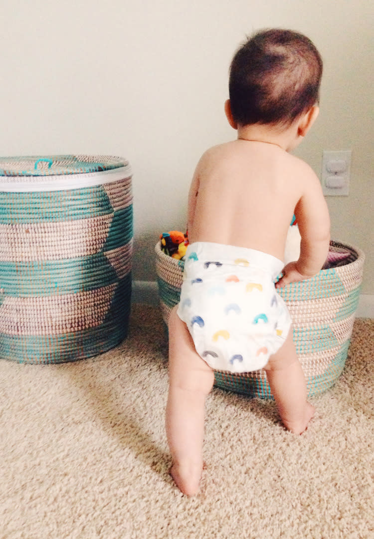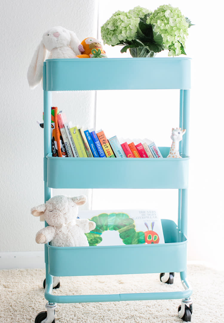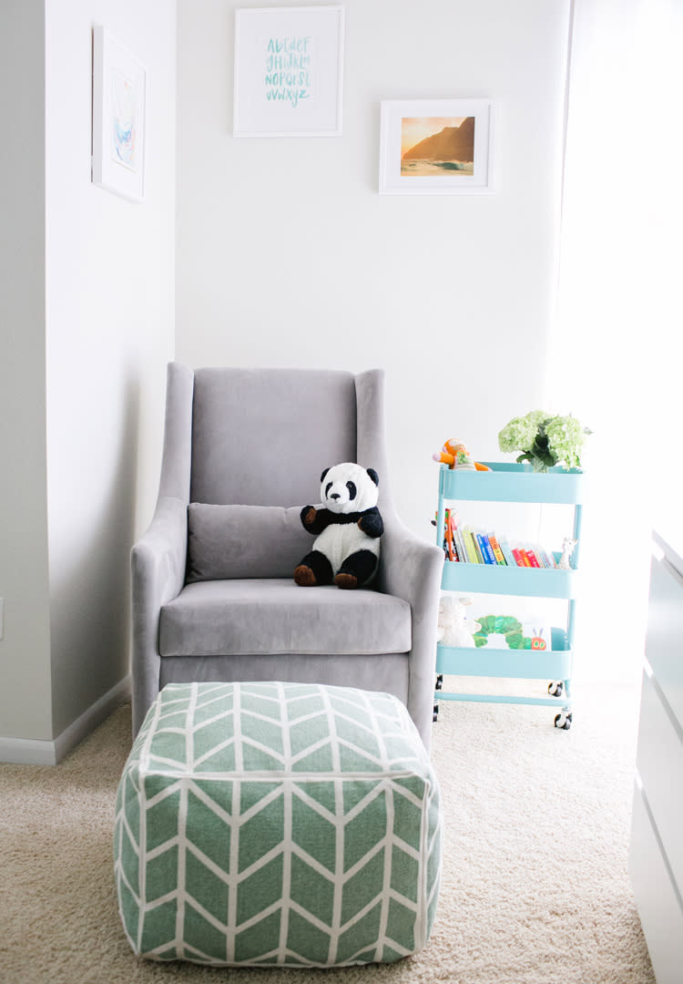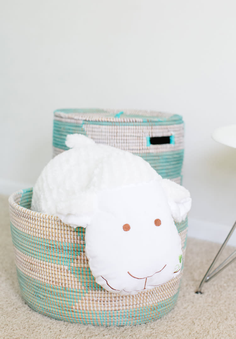 It all started with the herringbone baskets—I found them when I was around five or six months pregnant and decided to build on the mint and turquoise color family. I use one for laundry and the other toys. The overflow are stashed in her closet or a contained area of the living room.