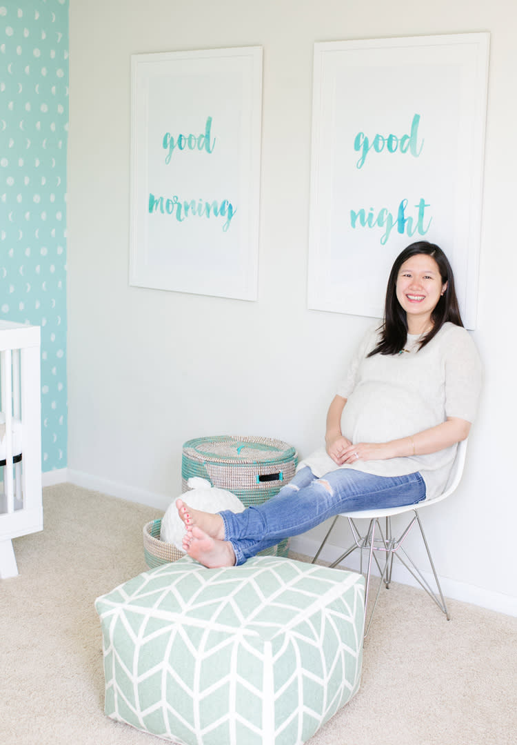 When PR maven Connie Wong set out to design her agency Moderne Press’s new office space, she didn’t know she’d soon be decorating another room to spend even more time in: her first child’s nursery. Toward the end of her second trimester, Wong and her husband set out to renovate the home office of their San Francisco Bay Area rental condo, adding patterned wallpaper and white paint to make the room a cheerful and light-filled space for their now 1-year-old Kate. The Bump spoke with Wong to learn the inspiration behind her soothing color scheme, custom artwork and chic mix of budget-friendly and splurge-worthy furniture.