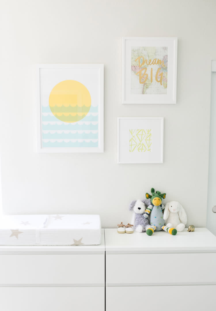 Artwork: Abstract print, Britt Bass Turner; alphabet print, Ink In The Ozarks; Makapu’u beach photo, Zak Noyle Photography; “Sunset by the Seashore” print, Honey & Bloom; “Dream Big” print, Paper Source; kites print, Linda & Harriet; “Good Morning” and “Good Night”, Wong designed, printed on Art.com and framed with Framed & Matted