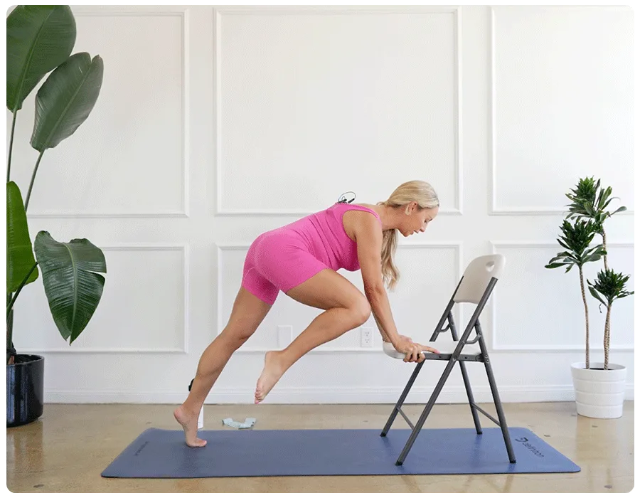 This exercise is a great way to strengthen your core and pelvic floor in a controlled manner. Place your hands on a chair for support and extend your legs straight into a plank. Inhale to prepare, then exhale as you pull one knee into your chest. Inhale as you return the foot to the starting position, alternating your legs at a slow, steady pace to maintain control and proper breathing.